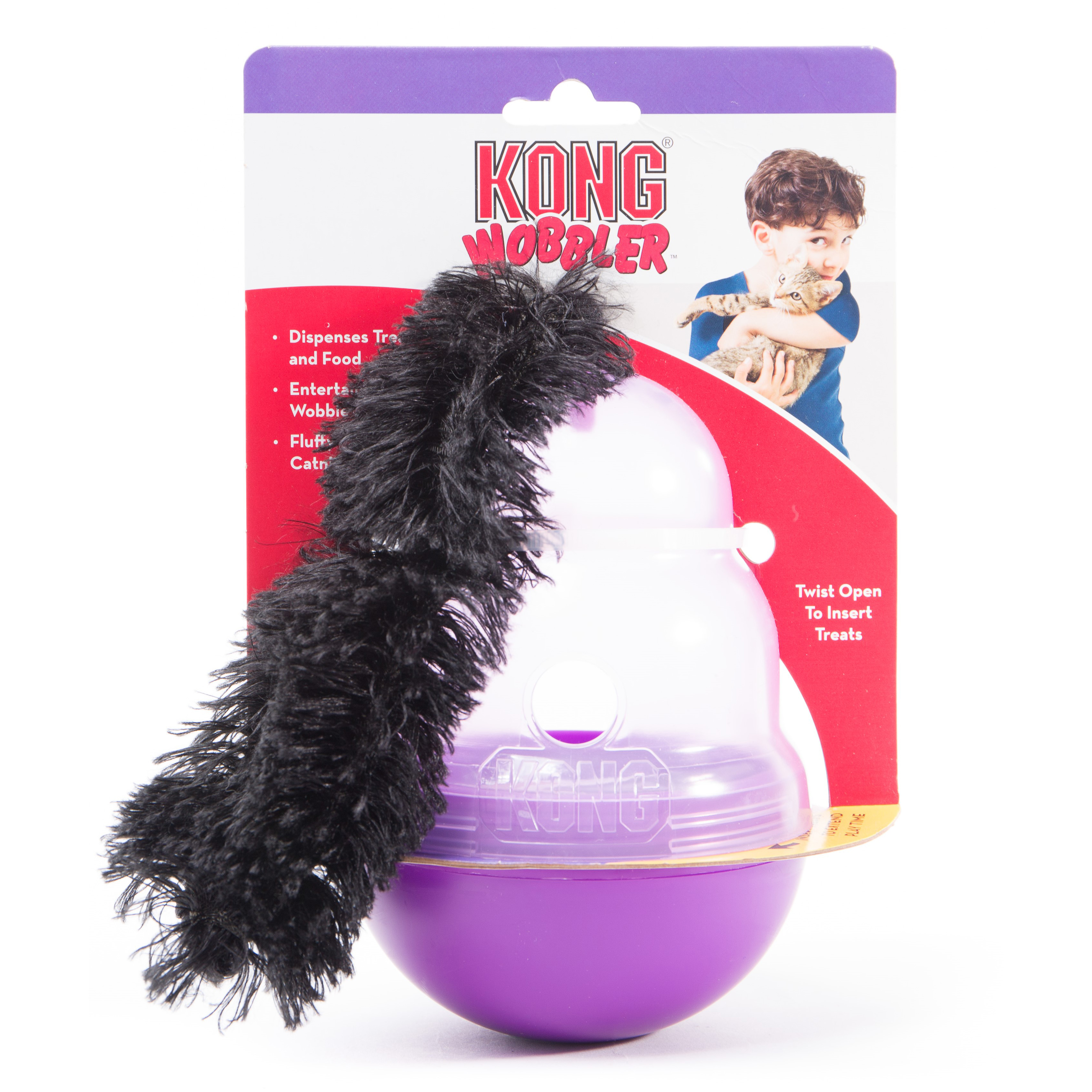El KONG Wobbler™ es un juguete que llama a la acción y resulta estimulante para la mente del perro porque puede alojar croquetas en su interior. Este juguete con la forma clásica de KONG permanece en posición vertical hasta que el perro lo empuja con las patas o la nariz y, entonces, salen de él deliciosos premios a medida que se tambalea, gira y rueda. El impredecible movimiento estimula instintos naturales y hace que hasta el usuario más experimentado se entretenga. El KONG Wobbler™ también puede utilizarse como una alternativa al tazón para prolongar la hora de la comida y, al mismo tiempo, aumentar el ejercicio de su perro. ¿Quiere que su perro pierda algunos kilos de más? El KONG Wobbler™ es un buen método para que su perro se mantenga activo y se esfuerce por obtener su comida. Se desenrosca para llenarlo y limpiarlo fácilmente. Use el Wobbler™ grande con perros de tamaño mediano a grande